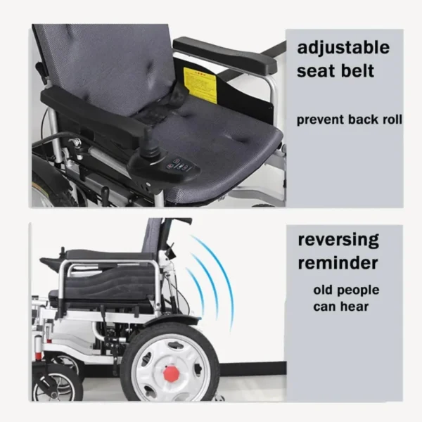 Safety features : The electric wheelchair with intelligent braking system, whether it is uphill, downhill or flat road, once your hands leave the joystick, the Foldable Electric Wheelchair will automatically brake to prevent from tilting. Bringing you the most comprehensive security protection.